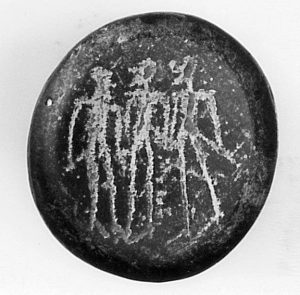 Ronde schijf van zwart gegoten glas met een vlakke bovenzijde voorzien van drie mager weergegeven staande menselijke figuren