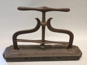 Mutsenstrijkijzer met een gedraaide houten greep met messing busje