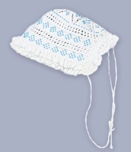 Wit katoenen mutsje gebreid, met blauwe kralen versierd