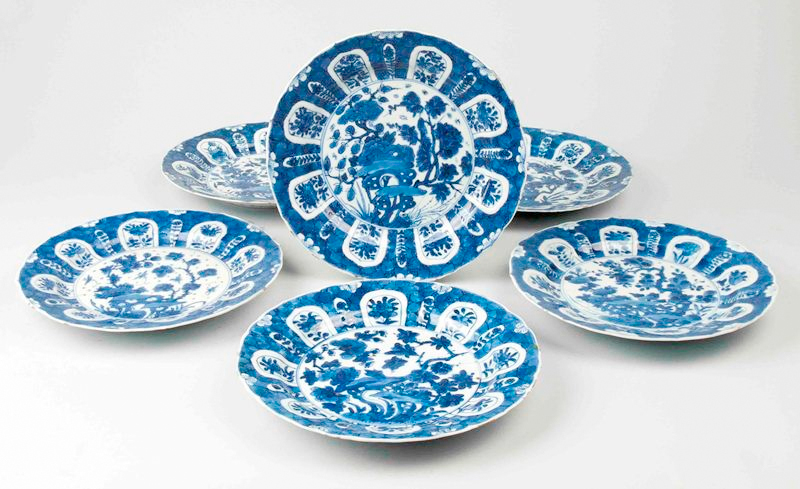 Een van zes borden van donkerblauw Chinees porselein met kartelrand