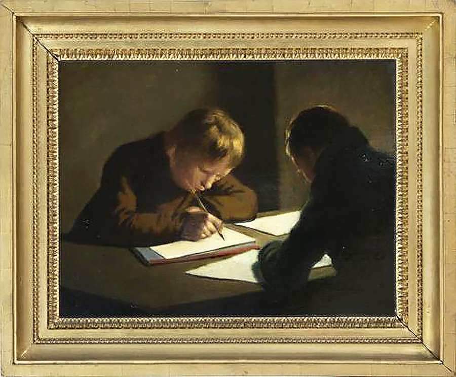 Dit lijkt een genrestuk, maar eigenlijk zien we hier een intiem portret van de twee kinderen van schilder Willem Bartel van der Kooi. De kinderen tekenen: de appel valt niet ver van de boom. Willem Bartel voedt zijn beide jongens alleen op: zijn vrouw Jetske is in het kraambed van het derde jongetje overleden, net als de baby.