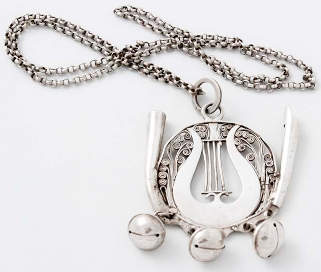 Rinkelbel met ketting in de vorm van een lier en vier bellen