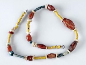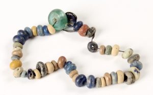 Halssnoer met 43 kleine discusvormige blauwe en grijswitte kraaltjes