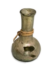 Groene miniatuurfles, lange hals, wijde buik en een holle trechtervormige bodem