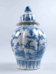 Kastvaas met deksel met decoratie in blauw van springend hert