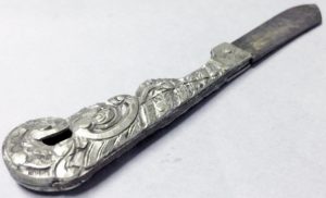 Mutsenstrijkijzer met een gedraaide houten greep met messing busje