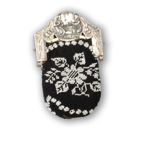 Zilveren beugelbeurs van kralen breiwerk, zwart fond, wit bloem patroon