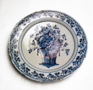 Bord van blauw Delfts aardewerk met bloemenrand