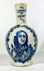 Kannetje op ronde spreidende voet met bolle buik en slanke hals met portret van Prins Willem III van Oranje